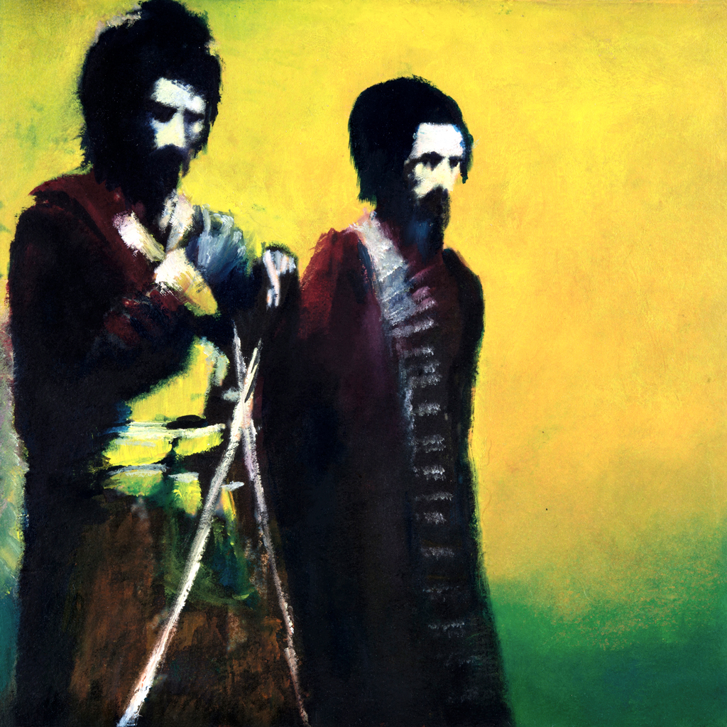 Cossacks in kilts, oil on paper, 20cm x 20cm.